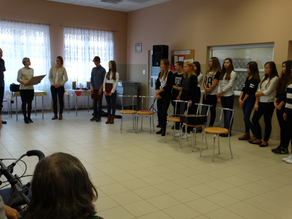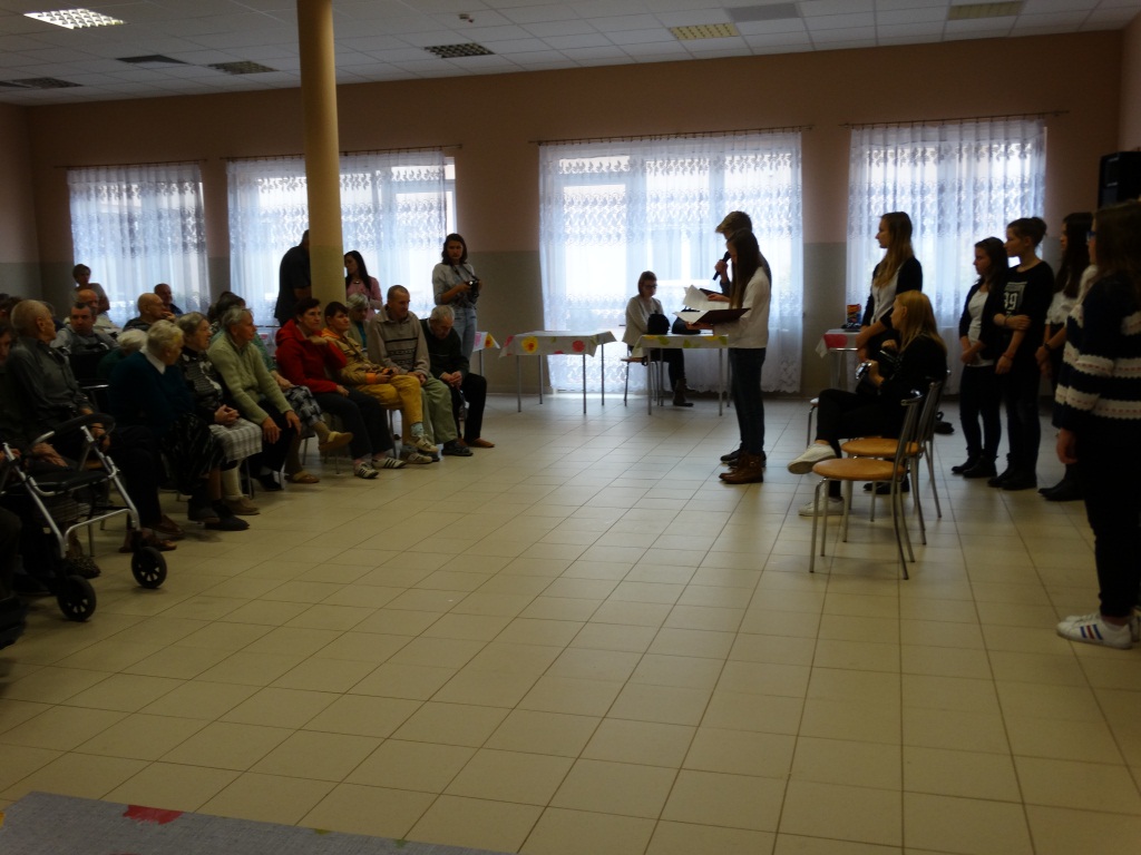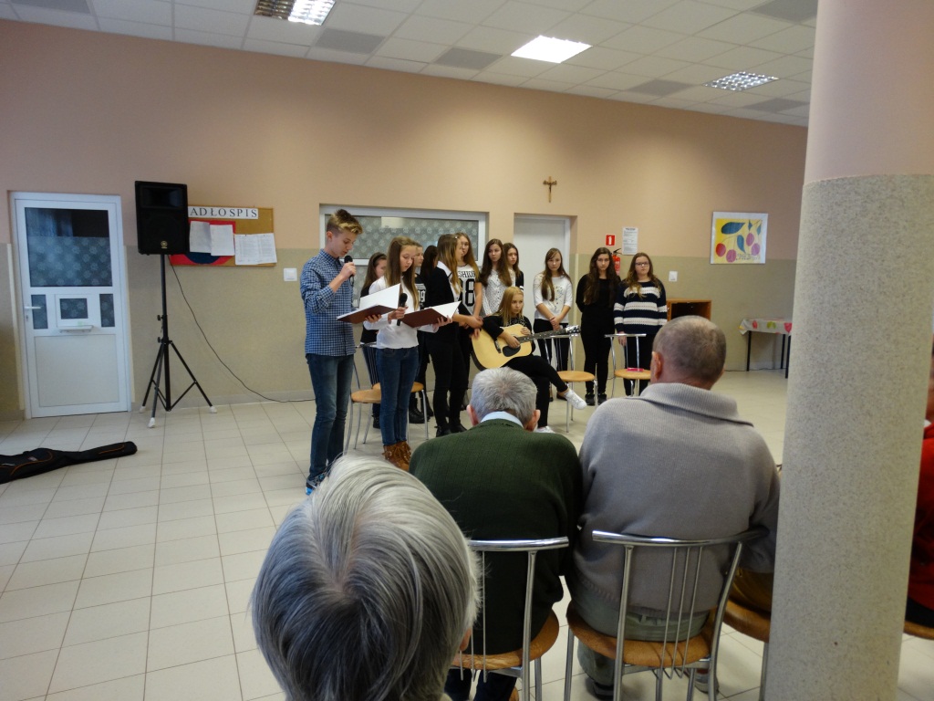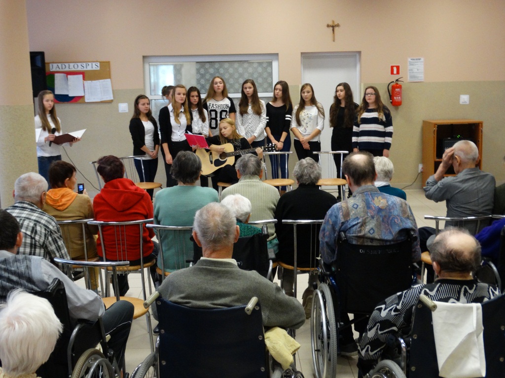 Bardzo miłą niespodziankę w dniu 20.10.15r. zrobiła młodzież z Gimnazjum z Żarnowa, odwiedzając naszych Mieszkańców z programem słowno-muzycznym poświęconym Św. Janowi Pawłowi II. Przy akompaniamencie gitary zaśpiewała m.in. takie utwory jak „Światłość dnia”, „Moje serce się w tobie zakochało” oraz wspólnie z Mieszkańcami „Barkę”. Podczas występu zostały przytoczone fakty z życia oraz drogi do świętości naszego Papieża, a także podkreślony był fakt miłości Jana Pawła II do ludzi i naśladowania go.