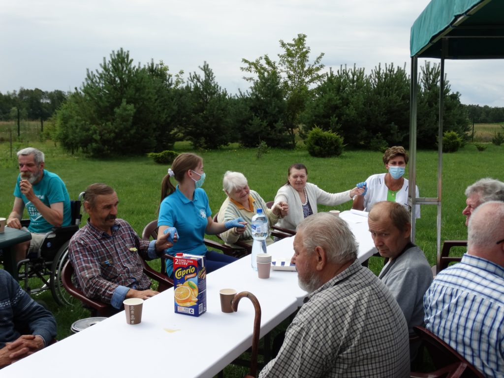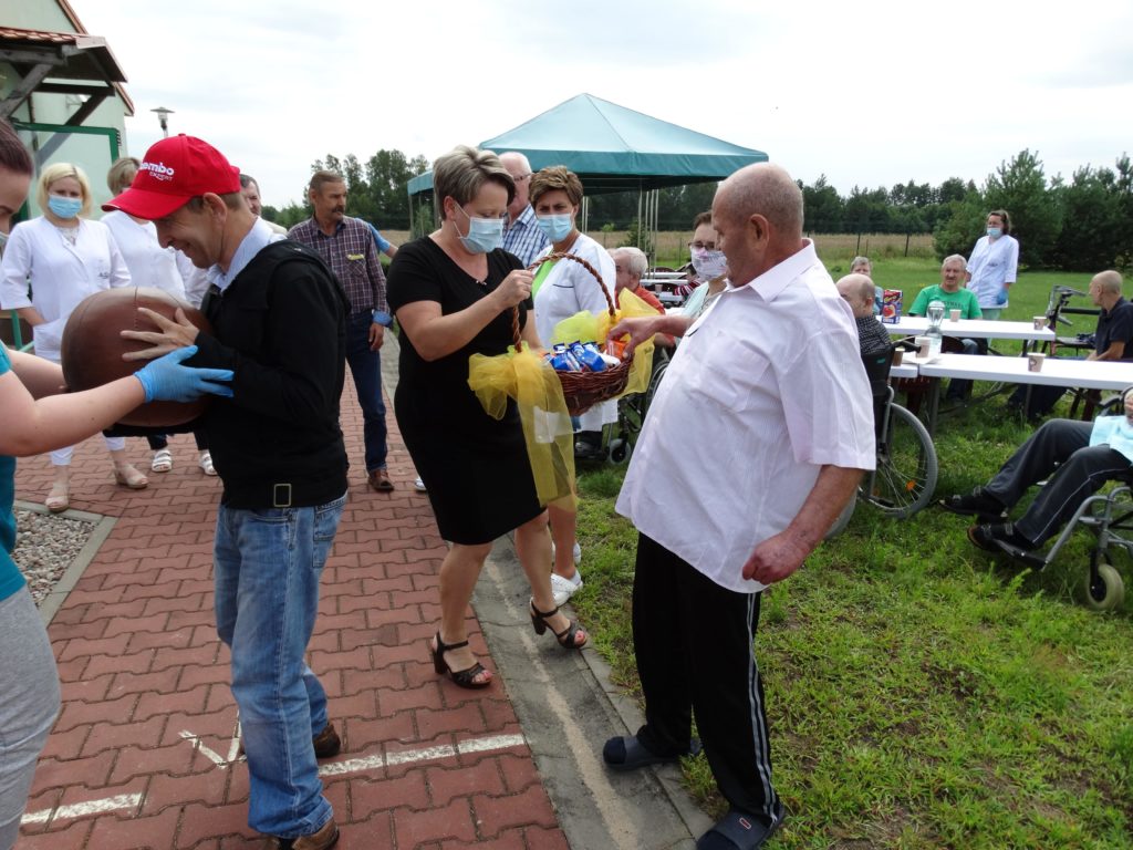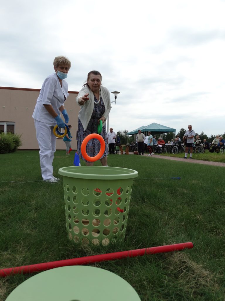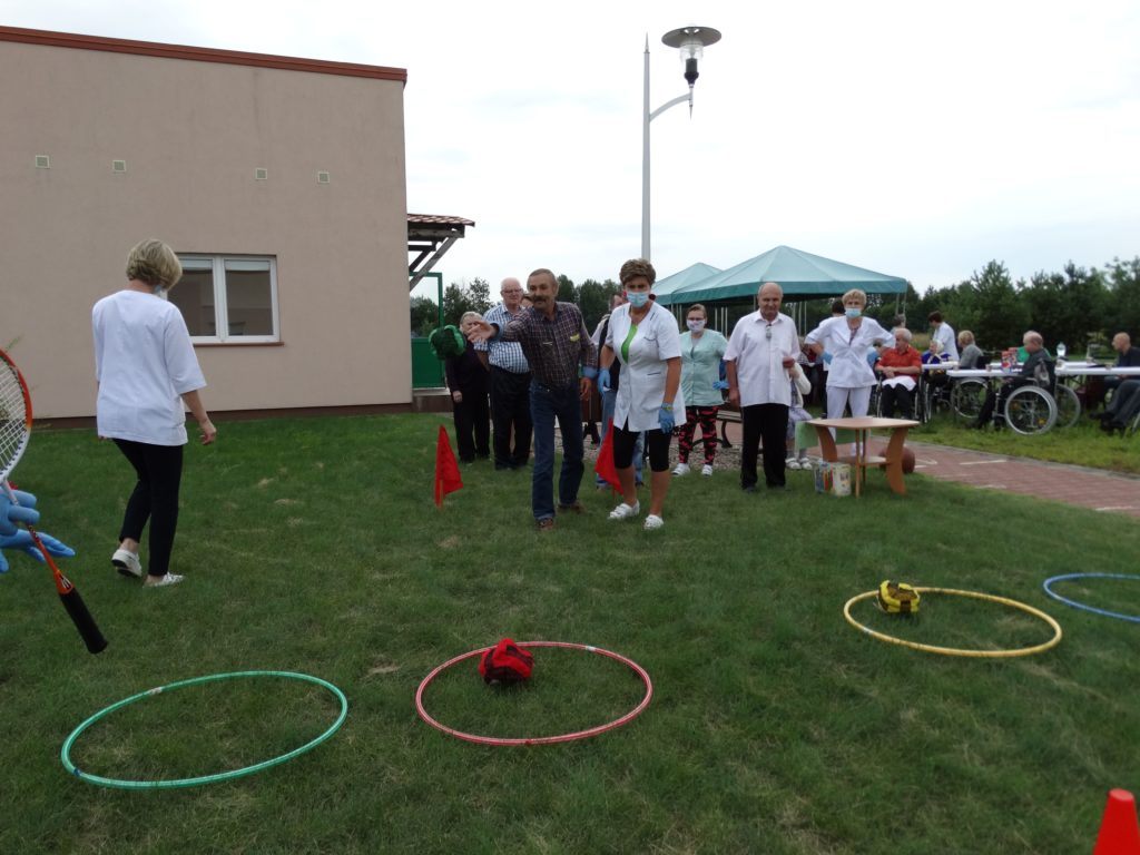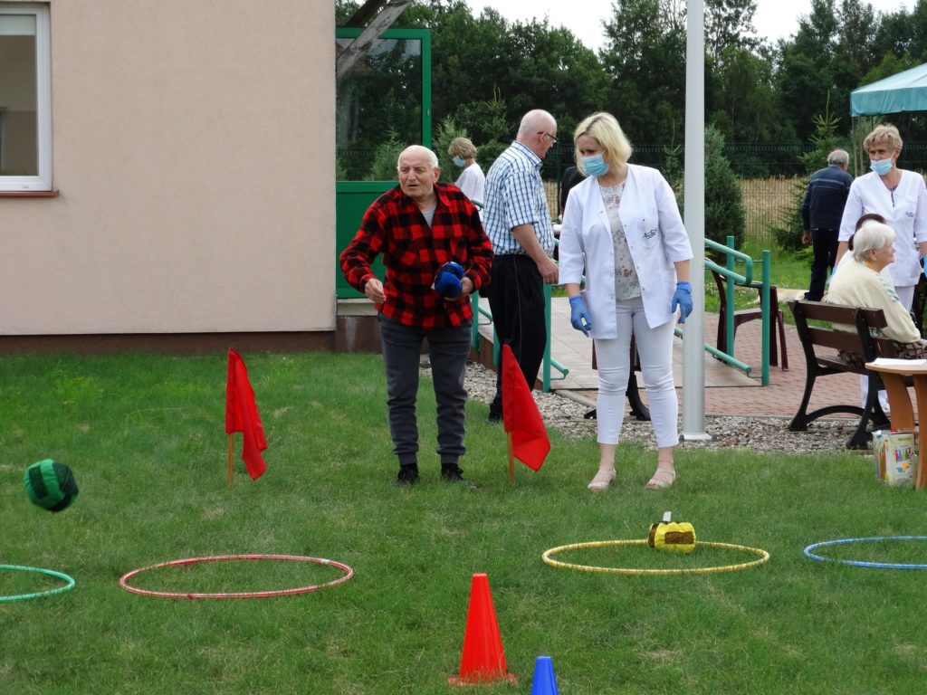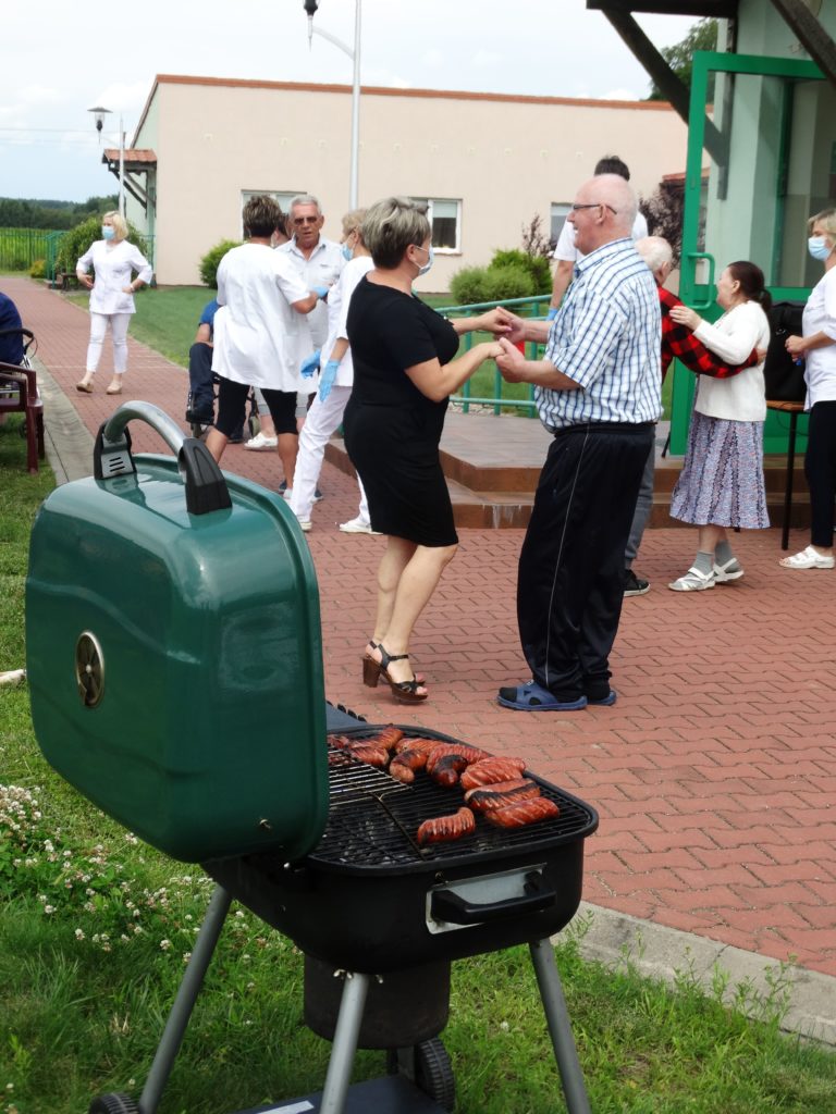 Przy pysznej kiełbasce z grilla, słuchając skocznej muzyki zachęcającej do tańca lub tylko do rytmicznego poruszania się miło spędziliśmy to słoneczne przedpołudnie. Całość dopełniły zabawy zręcznościowe cieszące się bardzo dużym zainteresowaniem wśród mieszkańców. Każda osoba uczestnicząca w konkursach sprawnościowych została nagrodzona słodkim upominkiem. Tak spędzone aktywnie przedpołudnie pozwala naszym Mieszkańcom odreagować trudne chwile, pomimo obowiązku zachowywania zasad epidemiologicznych wszyscy doskonale się bawili.