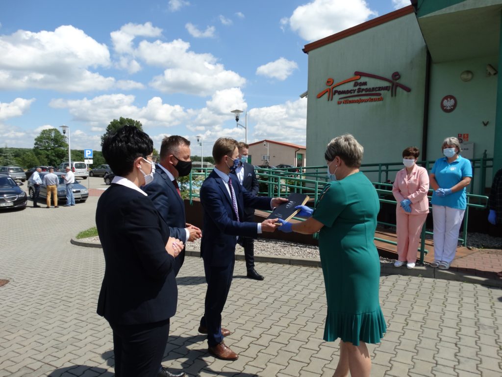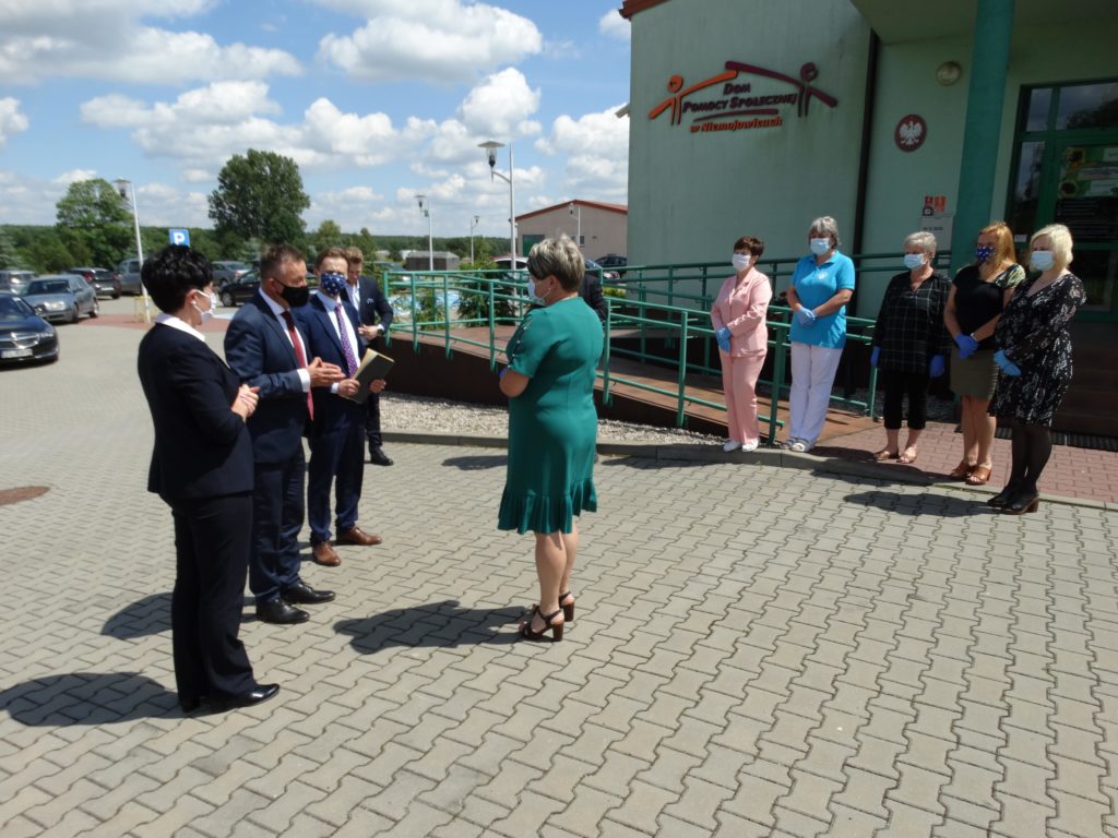 Celem wizyty było osobiste podziękowanie złożone na ręce pani Dyrektor Renaty Koneckiej dla wszystkich pracowników Domu Pomocy Społecznej w Niemojowicach za zaangażowanie w walkę z epidemią COVID-19.