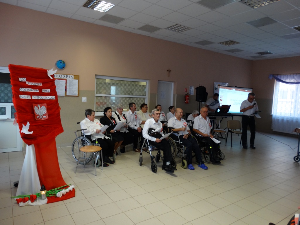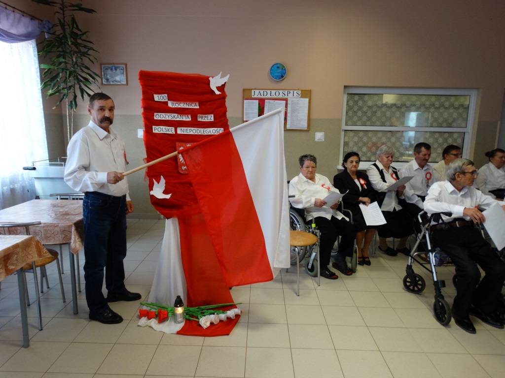 W celu uczczenia setnej rocznicy odzyskania niepodległości przez Polskę, grupa teatralna „Czarno to widzę” działająca na terenie Domu, przygotowała program artystyczny upamiętniający dzień 11 listopada. Stwarzając nastrój powagi i zadumy, w odświętnych strojach, występujący przybliżyli istotne fakty i osoby mające związek z tym ważnym dla naszego kraju wydarzeniem. Przygotowany montaż słowno- muzyczny rozpoczął hymn Polski zaśpiewany przez wszystkich zebranych, następnie  artyści recytowali wiersze i zaśpiewali m.in. takie utwory jak: „Ułani”, „Rozszumiały się wierzby płaczące”, „Rozkwitały pąki białych róż”. Występ bardzo podobał się zebranym i dostarczył wiele refleksji oglądającym oraz wzbudził wśród nich uczucia patriotyczne.